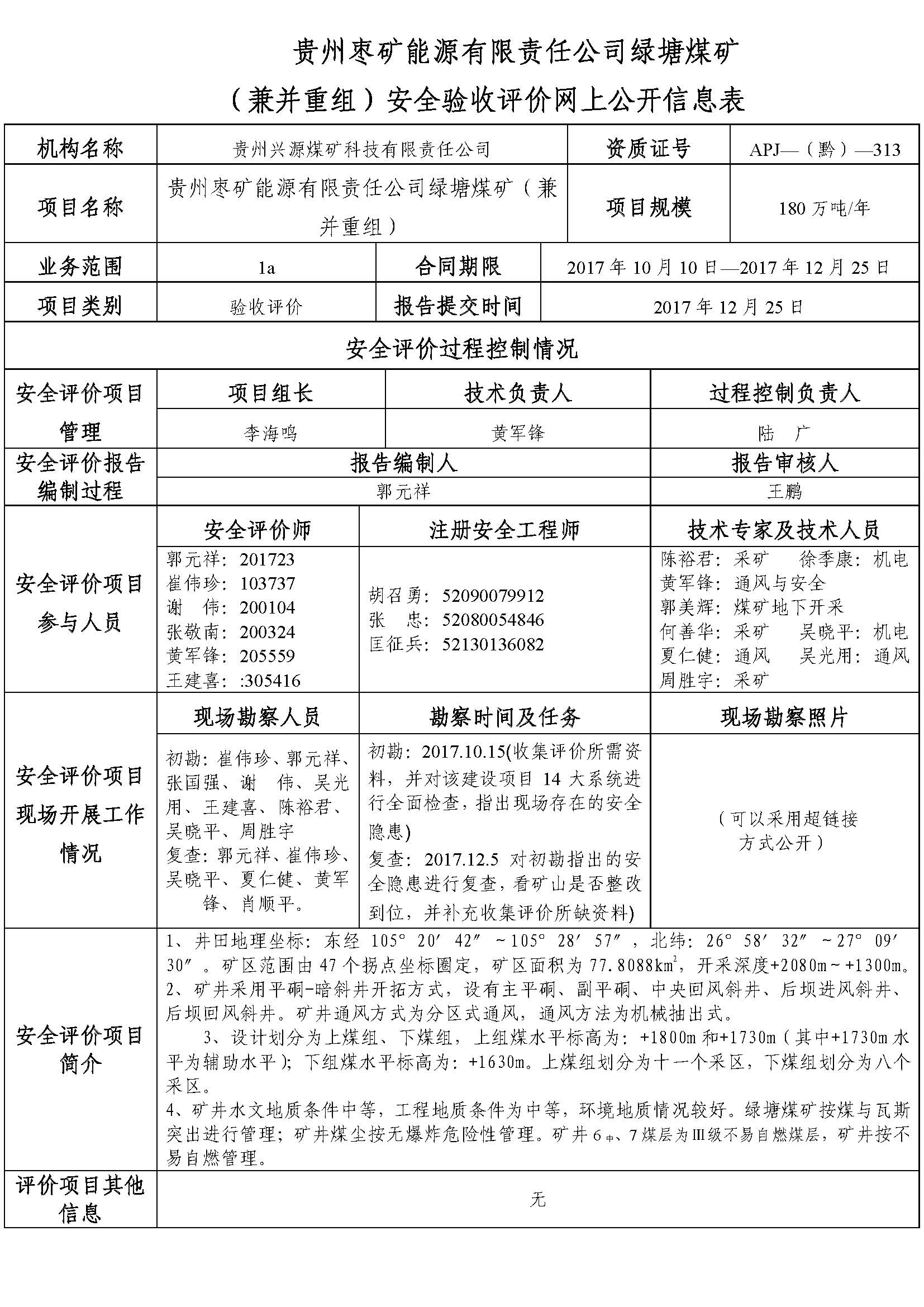 貴州棗礦能源有限責(zé)任公司綠塘煤礦(兼并重組)安全驗收評價網(wǎng)上公開信息表