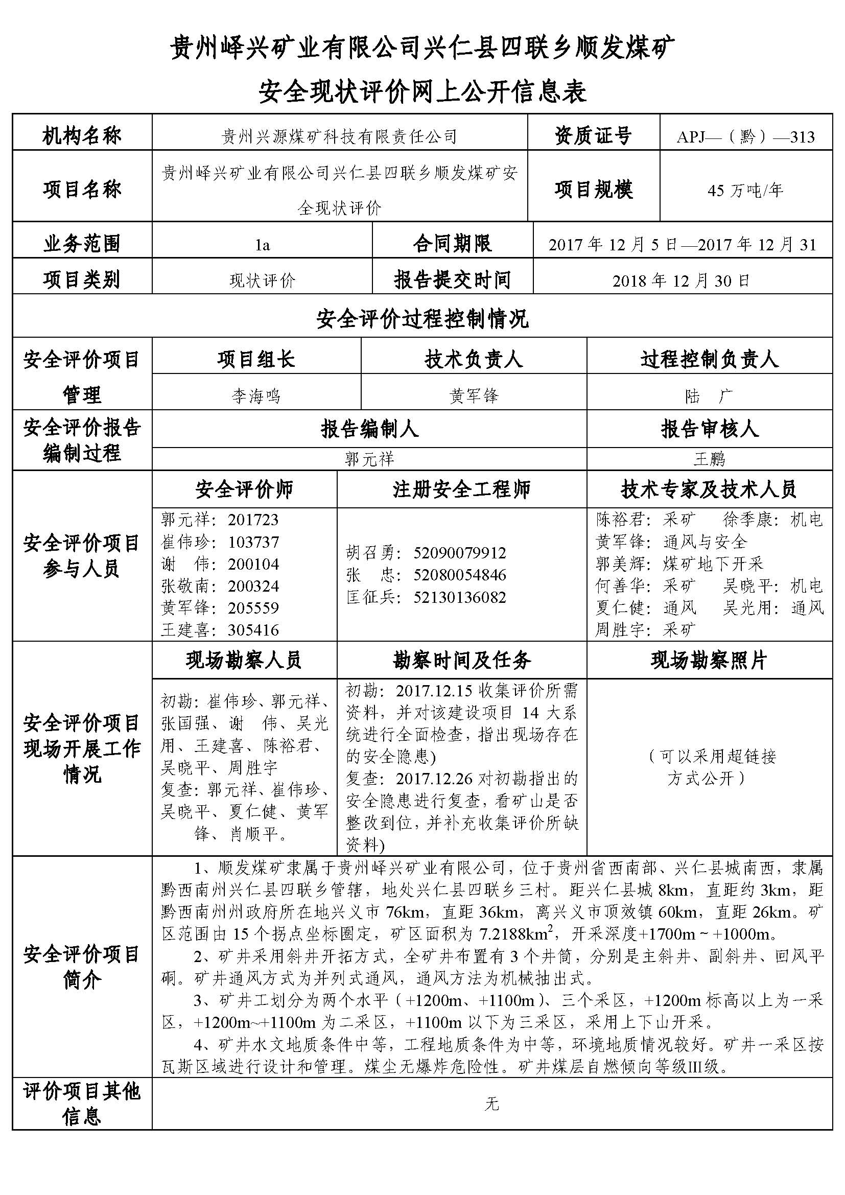貴州嶧興礦業(yè)有限公司興仁縣四聯(lián)鄉(xiāng)順發(fā)煤礦安全現(xiàn)狀評價網(wǎng)上公開信息表